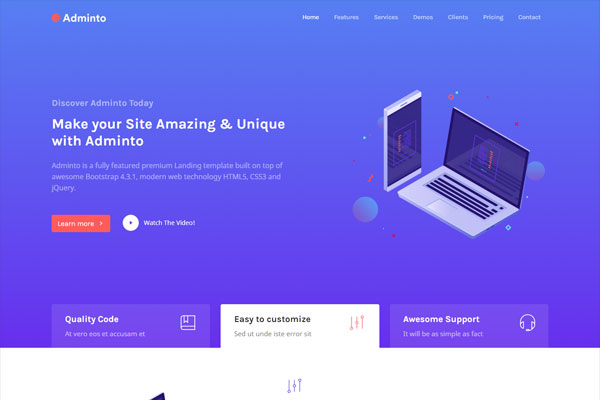 Adminto is a fully featured premium Landing template built on top of awesome Bootstrap 4.3.1, modern web technology HTML5, CSS3 and jQuery.